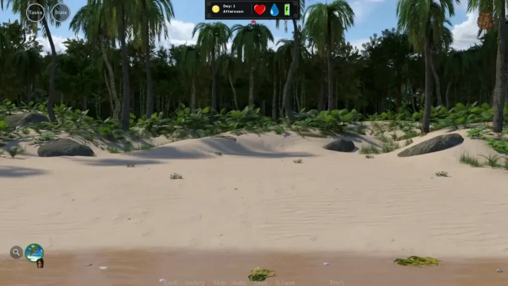 1. Water: Ignore everything else. Head inland from the beach and look for tell-tale green foliage. You’ll find coconut palms (smash a coconut on a rock) or a gentle freshwater stream. Your first drink is a core memory in this game.
